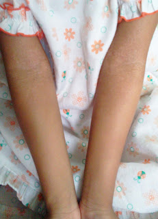 Nampak x kulit yg kehitaman tu? Ha...itulah kulit sebelum menggunakan MooGoo. Sudah nipis serta semakin gelap. Ok, masa ni dah mula kuar putih-putih bertompok. Kulit ketika ini sangat pedih apabila terkena air. Semasa mandi, Mija akan meraung dan rasanya mungkin jiran sebelah menyebelah boleh terdengar. Jangan mereka fikir aku dera anak sudahlah yer hehehehe :)